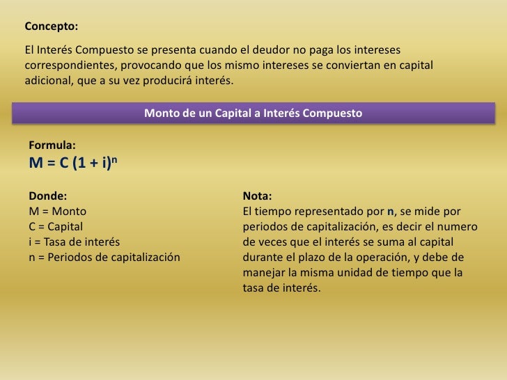 Ejercicios resueltos de Interés Compuesto Formulas de Interés Compuesto: M = C (1 + i)n C = M (1 + i)-n M = monto o también llamado VF; C = capital; i = tasa; n =tiempo Hallar la cantidad que es necesario colocar en una cuenta que paga el 15% con capitalización trimestral, para dispones de 20.000 al cabo de 10 años. i = 0,15 efectiva trimestral n = 10 años M = 20.000 C =? C = 20.000 (1+ 0.15)-10(4) 4 C =4.586,75 Respuesta ¿Cuántos meses deberá dejarse una póliza de acumulación de $2.000 que paga el 3% anual, para que se convierta en %7.500? n =? C = 2.000 i = 0,03 M =7.500 7.500 = 2.000 (1 +0,03)n ln 15/4 = n ln 1,03 n = 44,71 años 44,71 años * 12 meses = 536,52 meses Respuesta. 1 año Hallar el valor futuro a interés compuesto de $100, para 10 años: a. al 5% efectivo anual M = 100 (1 + 0,05)10 = 162,89 Respuesta b. al 5% capitaliza...